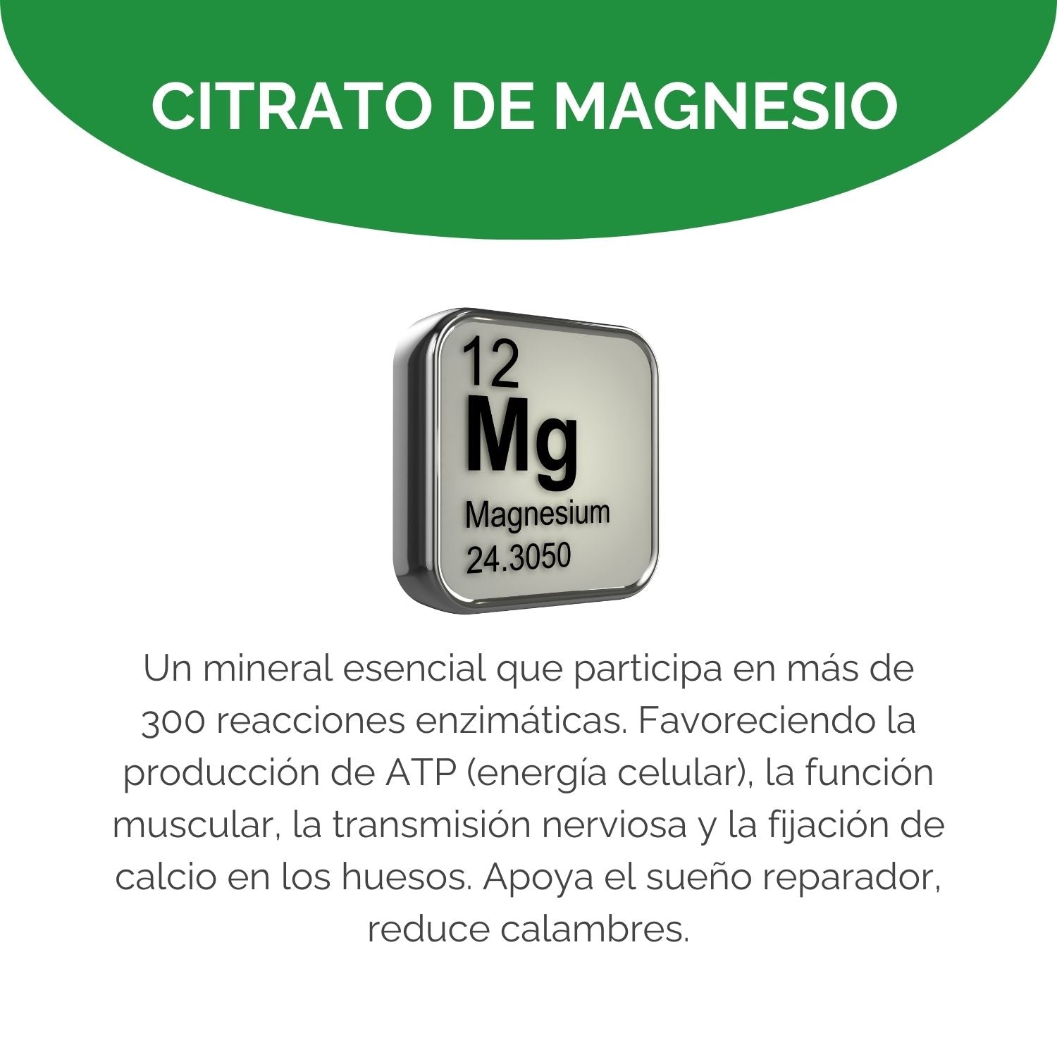 Favorece el descanso, la energía celular y la digestión. Con Magnesio altamente biodisponible que apoya la relajación, reduce calambres y fortalece huesos.