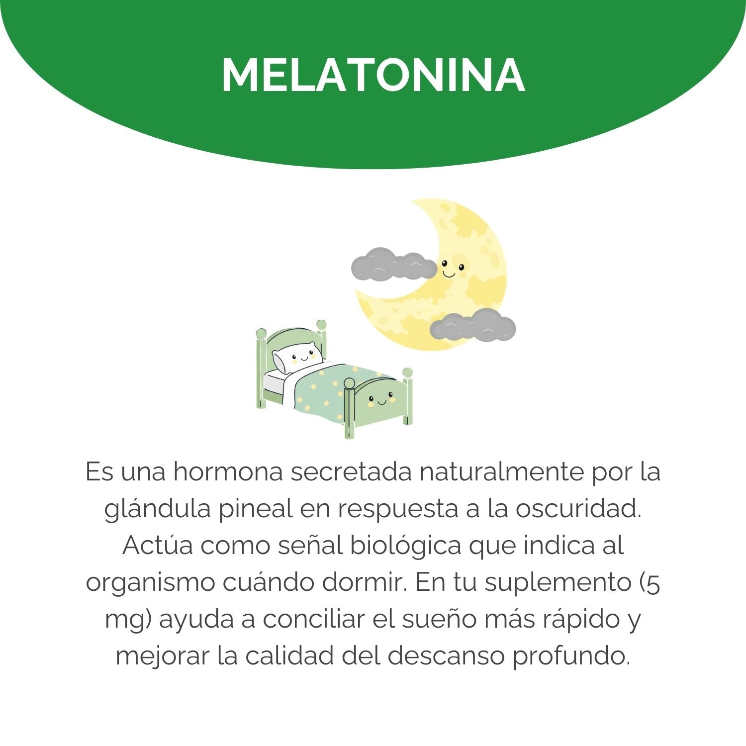 La melatonina es una hormona natural que regula el ciclo circadiano. Tomarla como suplemento ayuda a conciliar el sueño más rápido y mejorar la calidad del descanso.